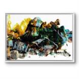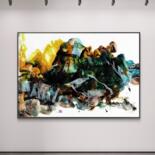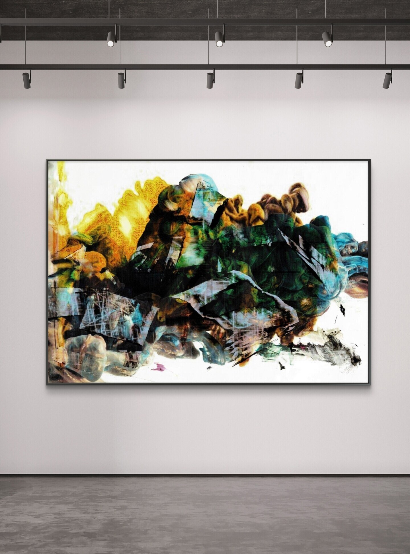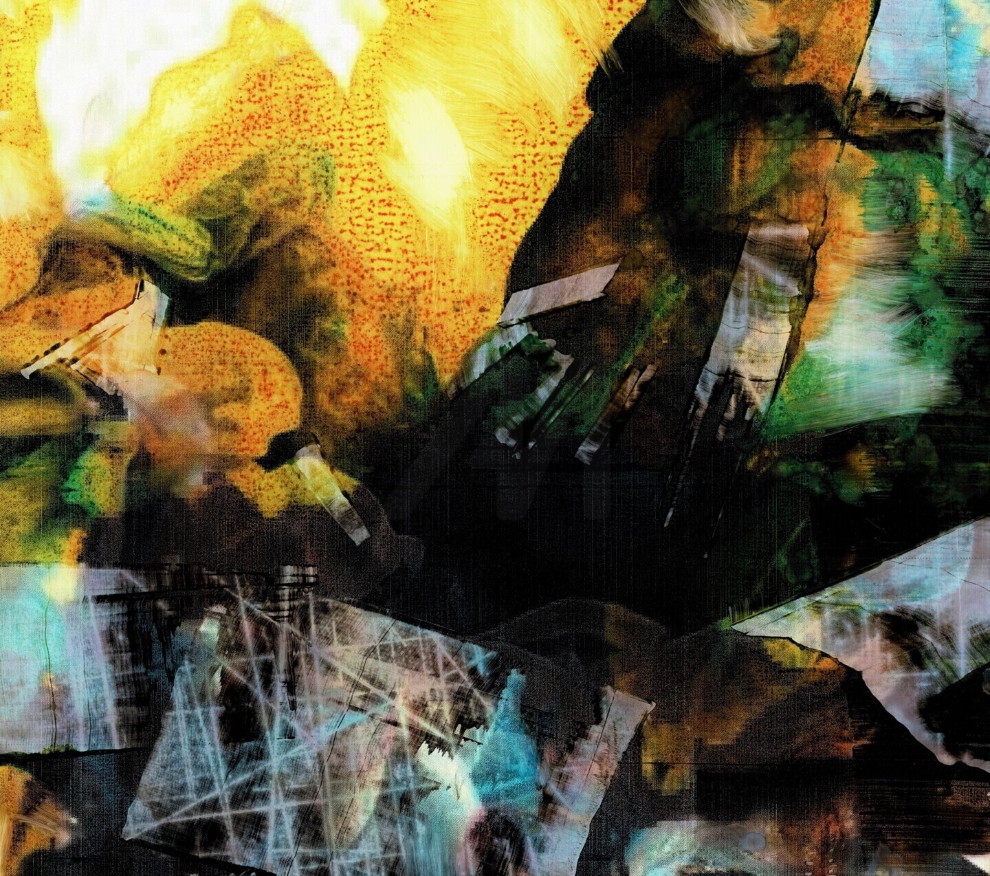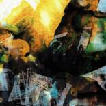 This painting presents a dystopian landscape. At first glance, the vibrant green and yellow forms might suggest a beautiful natural scene. This surface impression is quickly broken by clear signs of environmental destruction. The organic shapes are disrupted by fragmented lines and artificial, grid-like structures, creating a powerful tension between natural beauty and underlying decay.