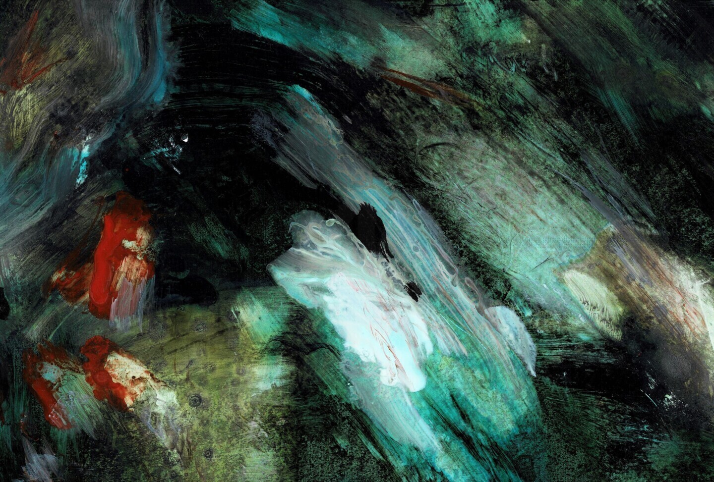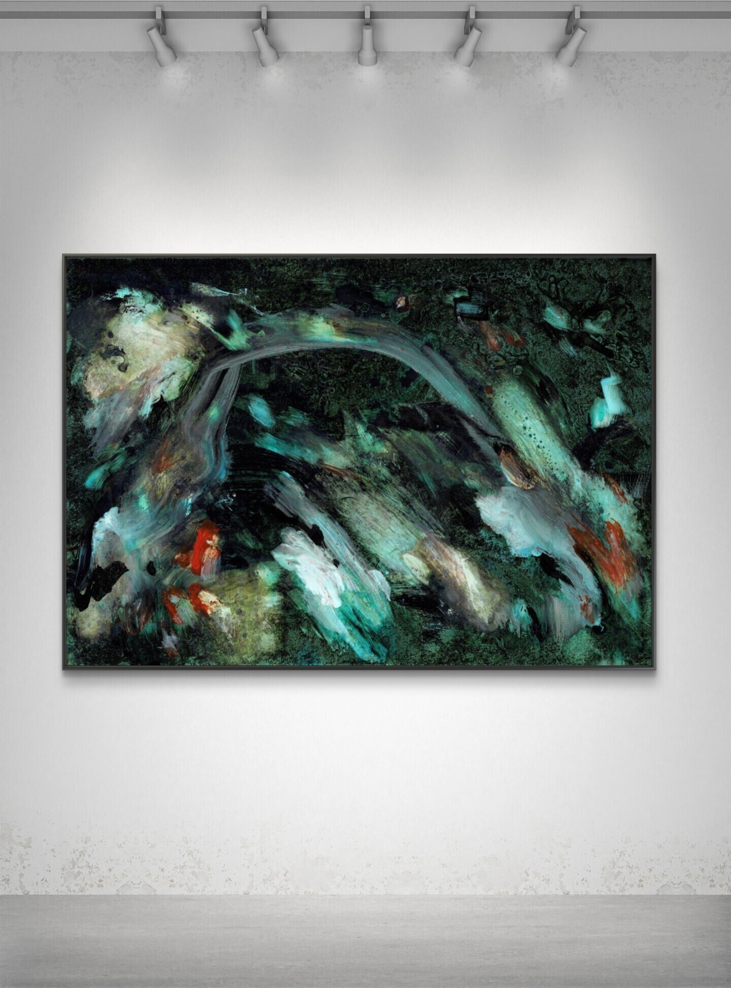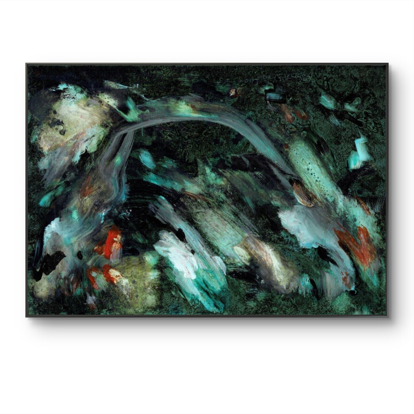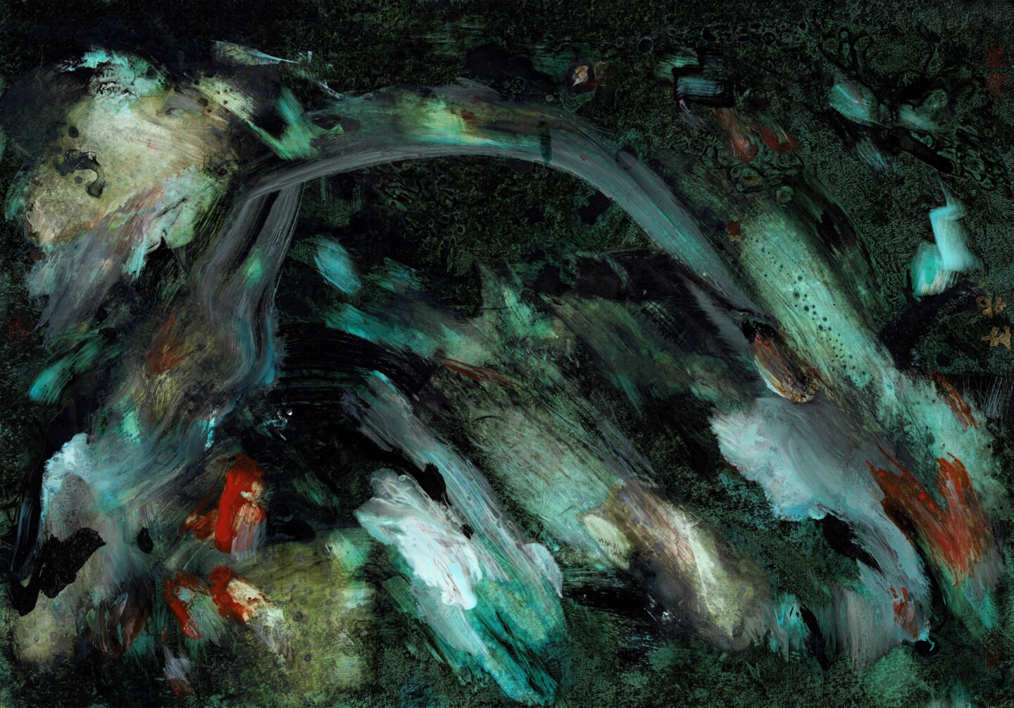 This piece uses ink and wash on paper and is inspired by Wagner's operas. While the composition is abstract, its dramatic, swirling forms and deep colors create a powerful atmosphere. The dynamic movement gives the work a narrative hint, suggesting a scene from a larger, epic story.