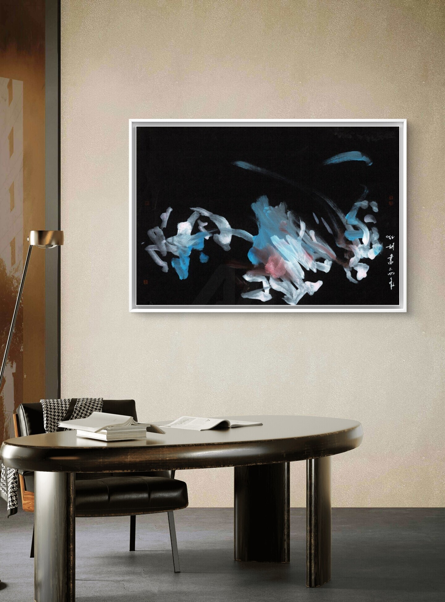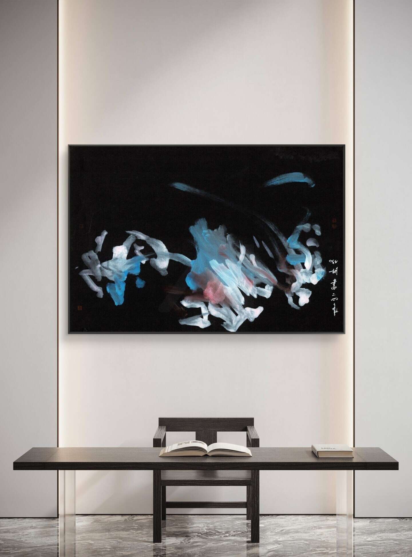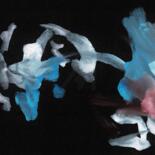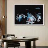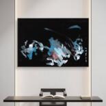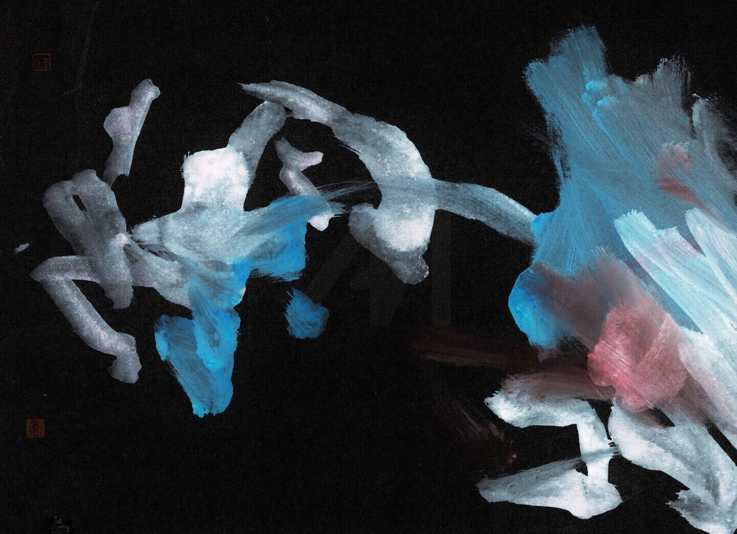 This gestural work uses mixed media on black construction paper. The piece is oriented towards Asian painting, which can be seen in the fluid, calligraphic brushstrokes. Forms in light blue, white, and touches of red seem to float against the dark background, creating a strong sense of motion.