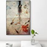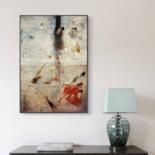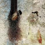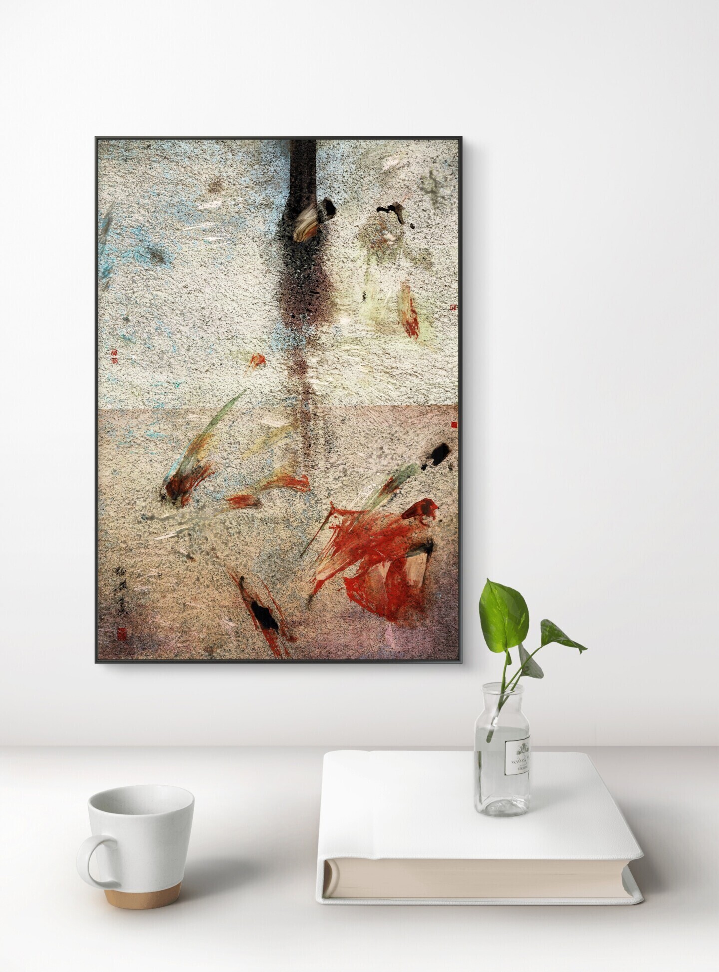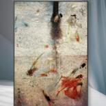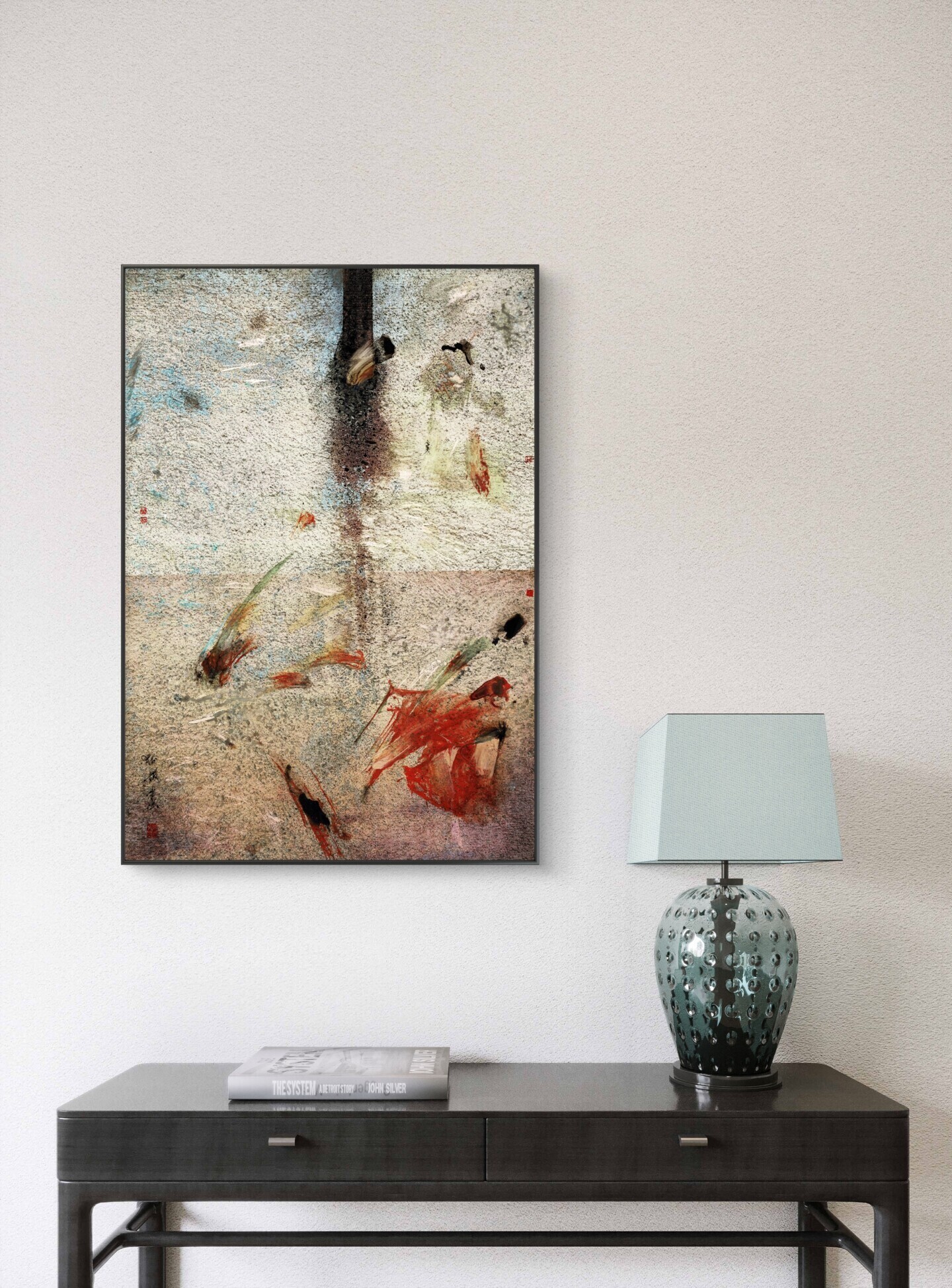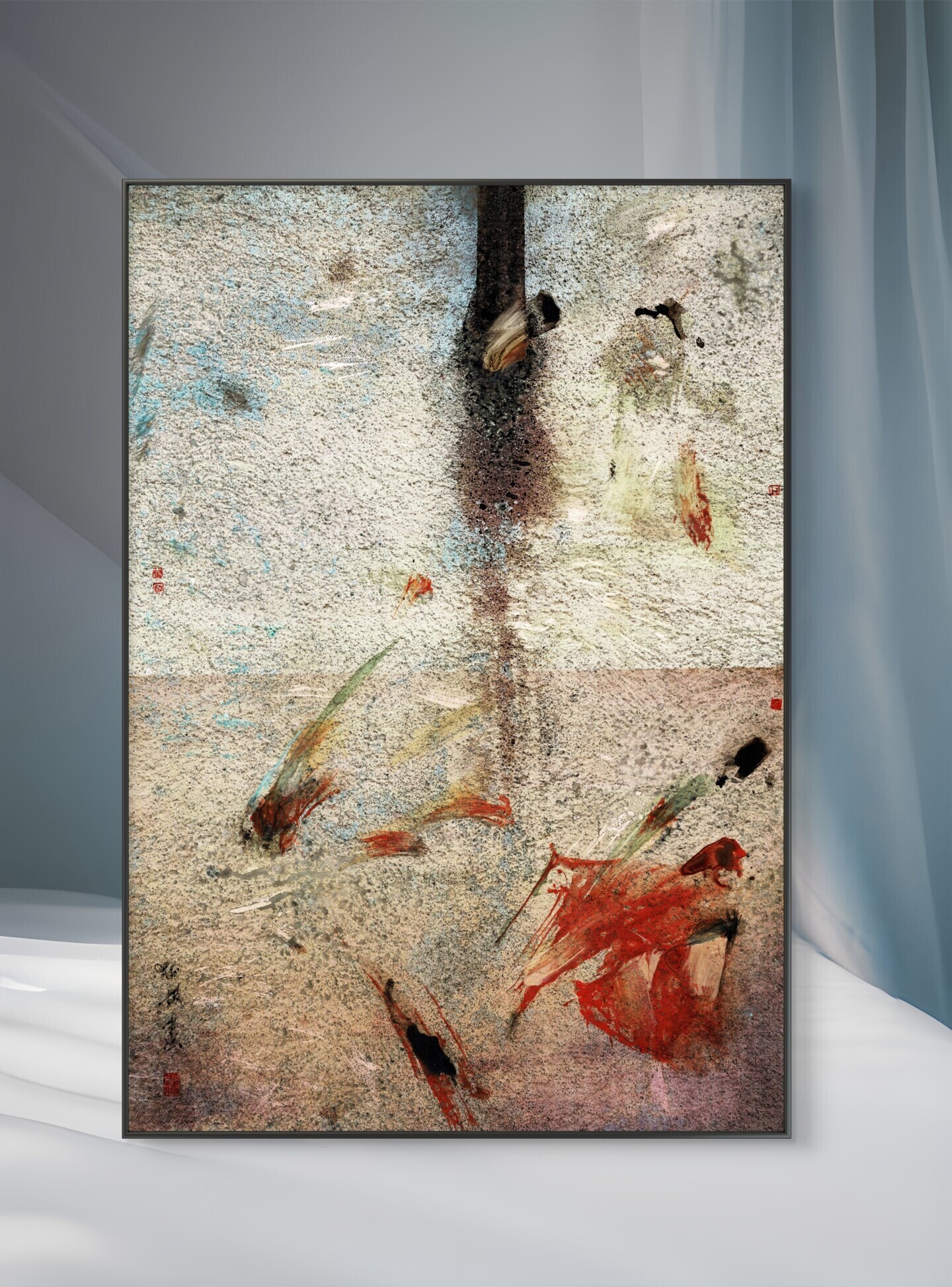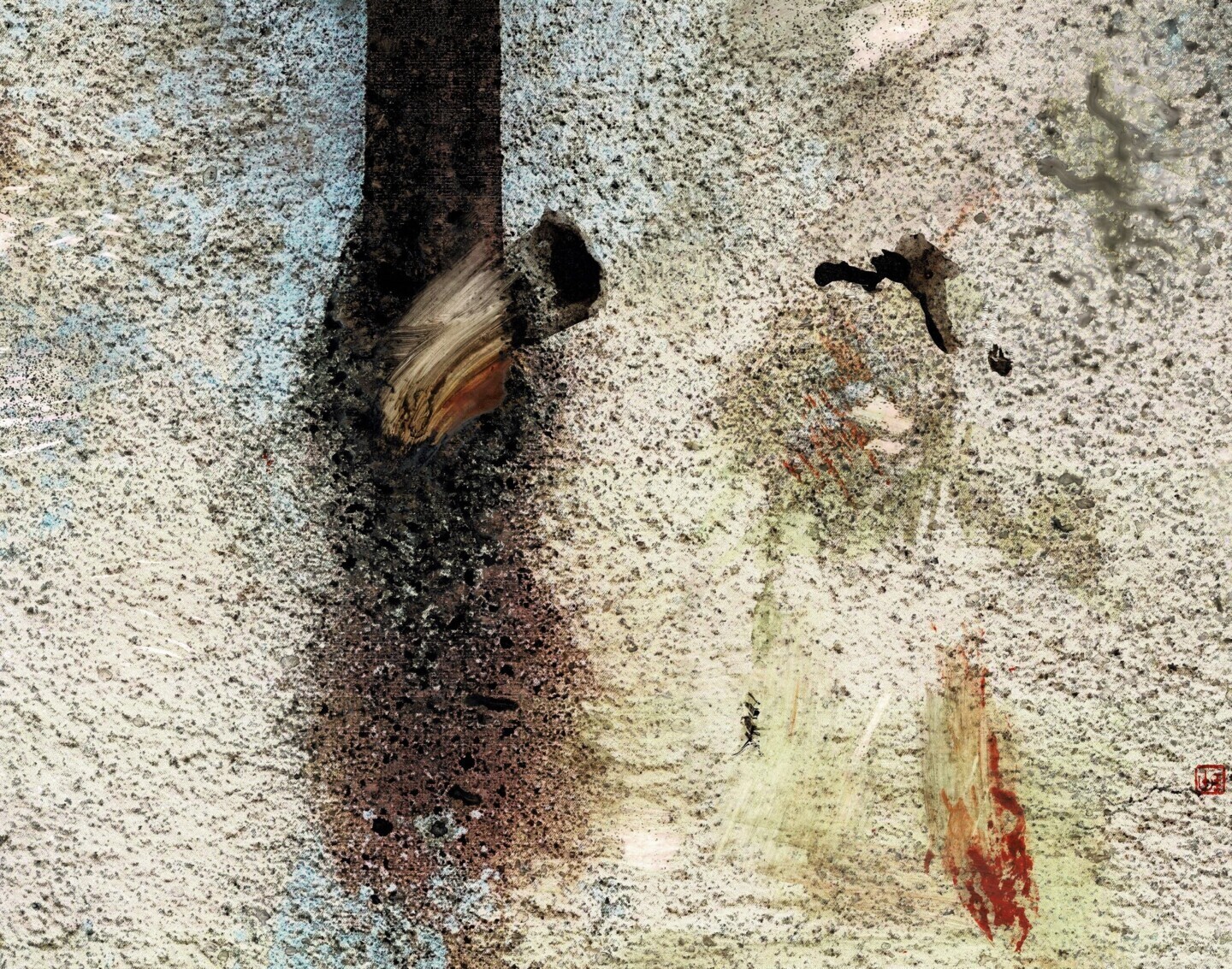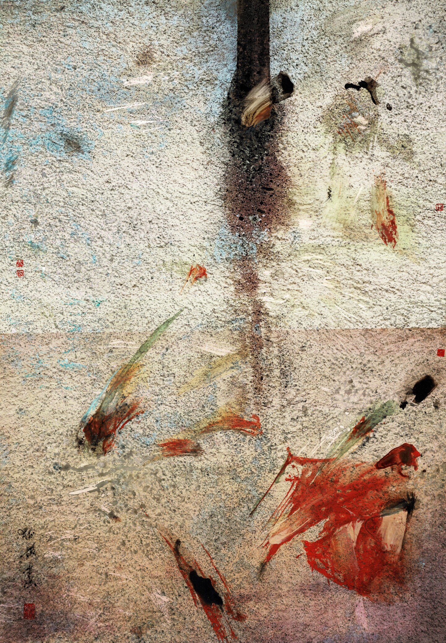 This painting is a work of abstract surrealism. It creates a dreamlike, slightly threatening atmosphere, with its composition oriented toward Asian painting. This influence is clear in the calligraphic marks, the prominent seals, and the division of space. The heavily textured surface is split into two horizontal fields, dominated by a dark, ambiguous form that runs down the center. Small, sharp strokes of red and black interrupt the scene, adding to the subtle feeling of unease.